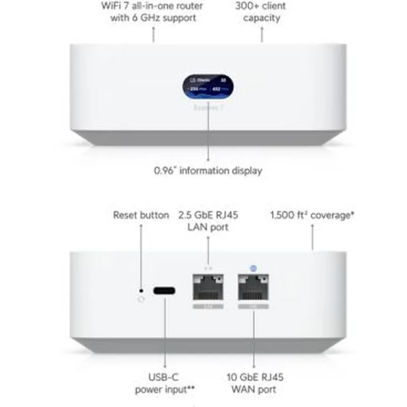Ubiquiti UX7 Gateway en la nube compacto mesh Wifi 7 con 1 x 2.5 GbE RJ45 y 1 x WAN 10 GbE RJ45. Rendimiento IDS/IPS 2,3Gbps,2×2 Mu-MIMO en 2,4,5 y 6 Ghz. Rendimiento Wifi hasta 5,7Gbps en 6Ghz